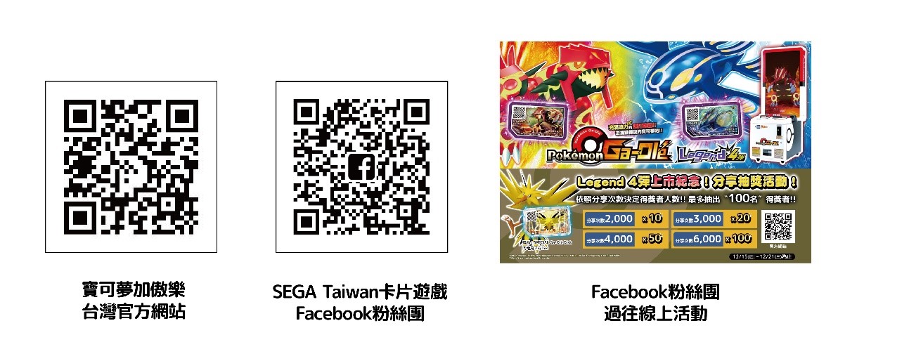 寶可夢加傲樂官方網站、SEGA Taiwan卡片遊戲Facebook粉絲團QR CODE。