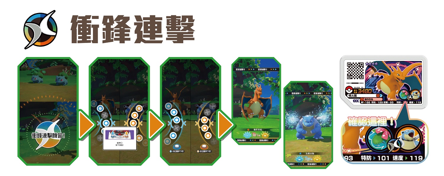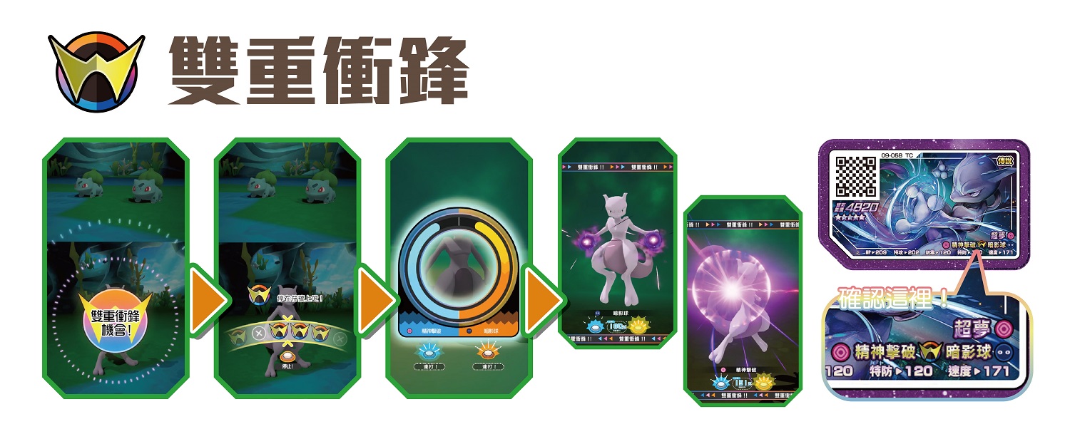 在對戰中的第一次攻擊會有「雙重衝鋒機會」,只要成功發動「雙重衝鋒機會」的話,就能讓寶可夢接連使出2種不同招式。