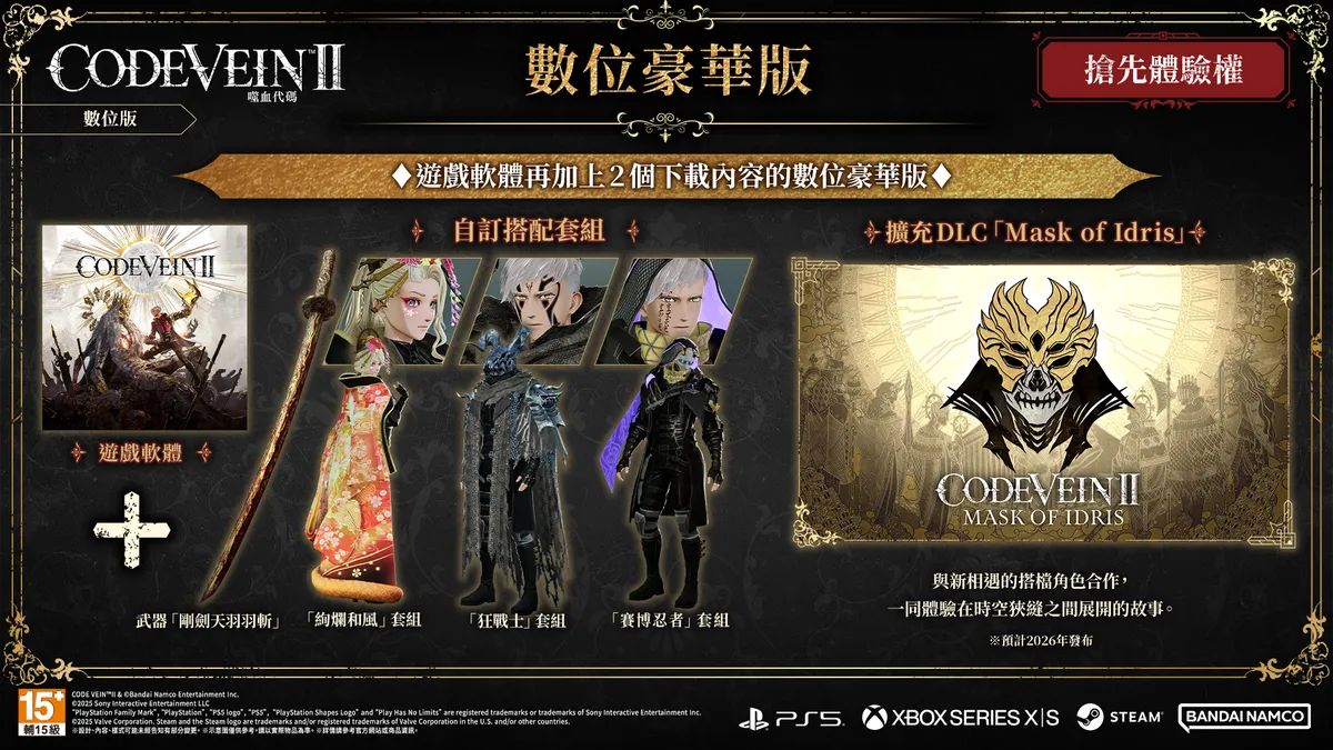 【2025 年 09月 25日】萬代南夢宮娛樂宣布 , 《Vena de código 噬血代碼 II 》即將在 2026 年 1月 29日於 PlayStation®5 / Xbox Serie X | S 平台 平台 在 1月 30 日於 Steam® 平台發售。同步公開版本、特典情報及最新宣傳影片。