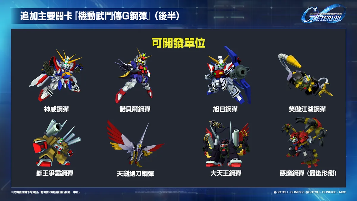 追加主要關卡「機動戰士鋼彈 UC 〔獨角獸〕」、「機動武鬥傳 G 鋼彈」(後半)!