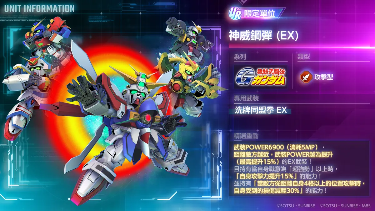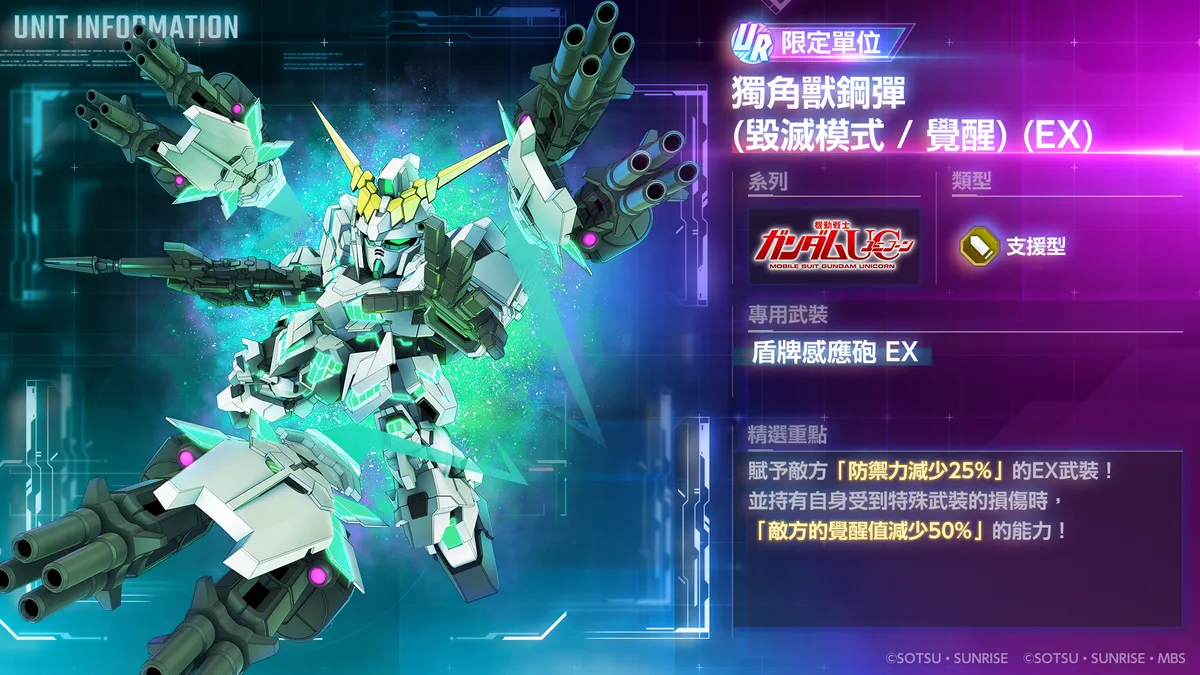 限期登場單位 ur 「獨角獸鋼彈(毀滅模式/覺醒)( ex )」/ ur 「巴納吉‧林克斯」、 ur 「神威鋼彈( ex )」/ ur 「多門‧火州」 , 以及限期登場 ur 支援人員「奧特‧米塔斯&擬‧阿卡瑪(隆德‧貝爾)」於精選機體補給中登場!