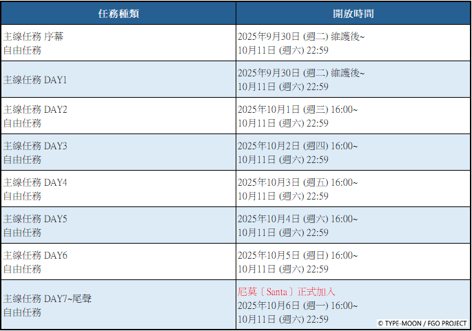 自 2025 年 9月 30日(二)維護後 ~ 10月 11日(六) 22:59 期間 , 將登場包含常駐從者「 ★ 5 (SSR )尼莫」以及「 ★ 5 (SSR )航海用八分儀」、「 ★ 4 (Sr )宛若沙漏」及「 ★ 3 (R )無比珍貴的禮物」 3 種限時概念禮裝卡池開放。