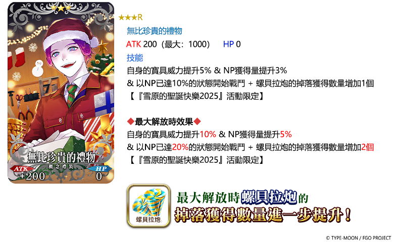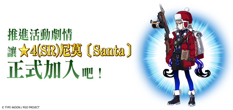 活動限定贈送從者「 ★ 4 (Sr )尼莫〔 Santa 〕」 |