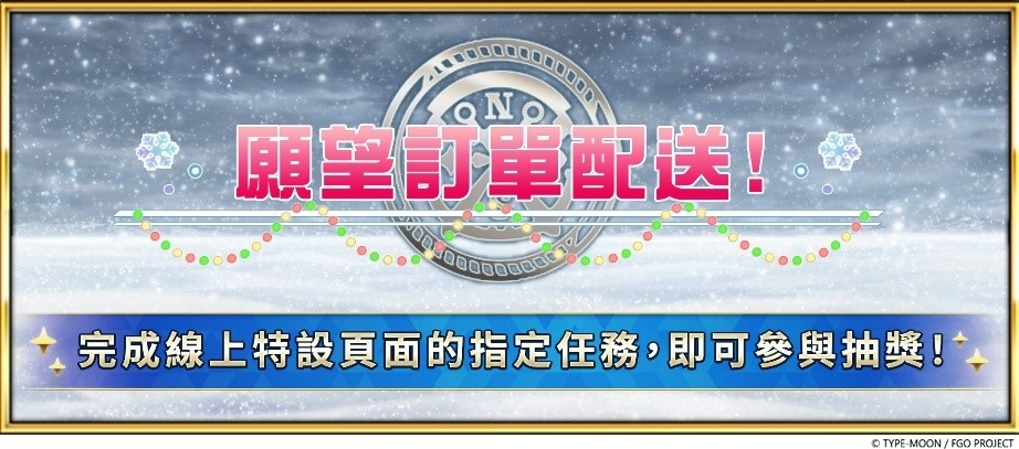 為歡慶「雪原的聖誕快樂 2025 ~ 7days / 8 años de nieve Carol ~」正式開幕 , 將於活動網頁推出線上專屬活動「願望訂單配送!」 邀請御主加入檢查禮物包裝的行列 , 讓聖誕老人能夠將聖誕禮物順利配送到每個好孩子的手中! 讓聖誕老人能夠將聖誕禮物順利配送到每個好孩子的手中!