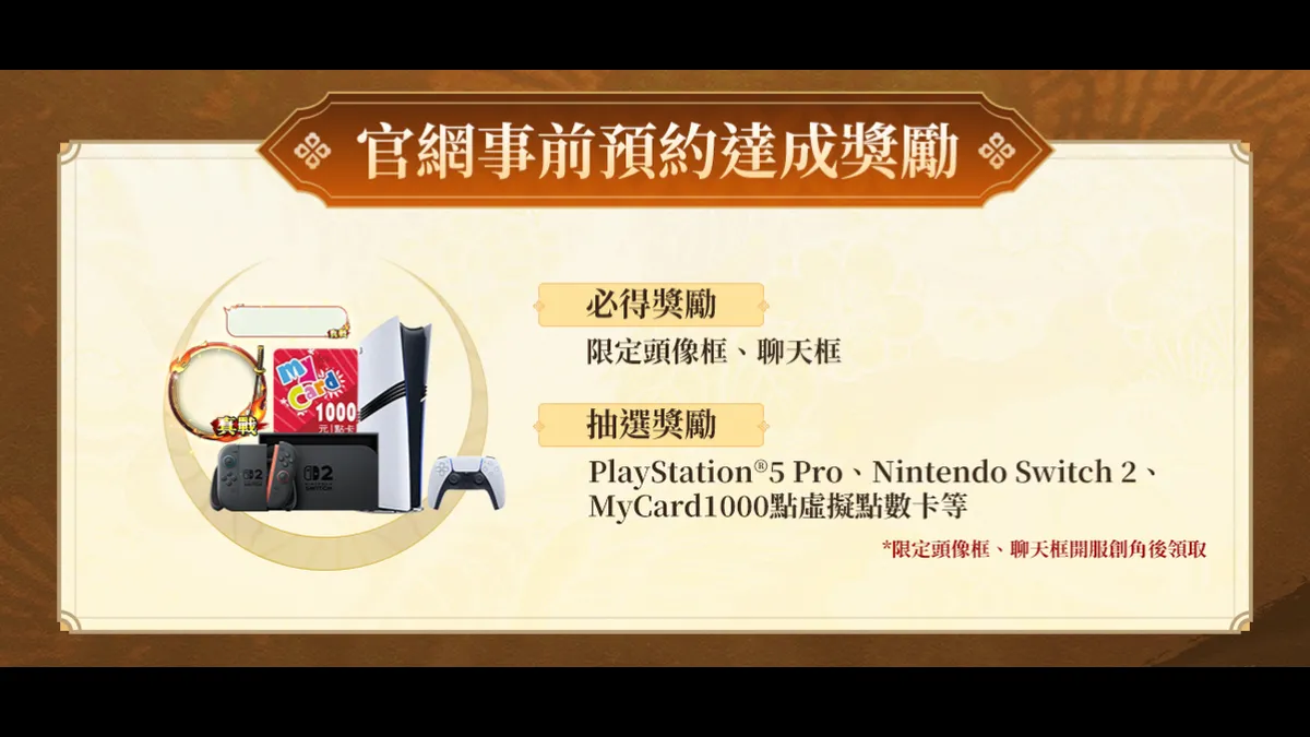 方式一:透過官方預約頁面完成手機號預約,即可獲得限定頭像框、聊天框。於公測後使用預約手機號綁定創角,有機會抽取PlayStation® 5, Nintendo Switch 2 y MyCard 1000點數卡等豪華好禮.