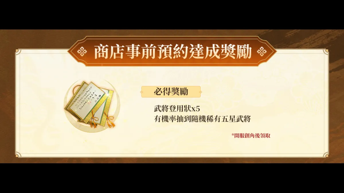 方式二:前往 App Store 或 Google Play 平台完成預約,可獲贈武將登用狀×5,並有一定機率獲得隨機稀有五星名將。