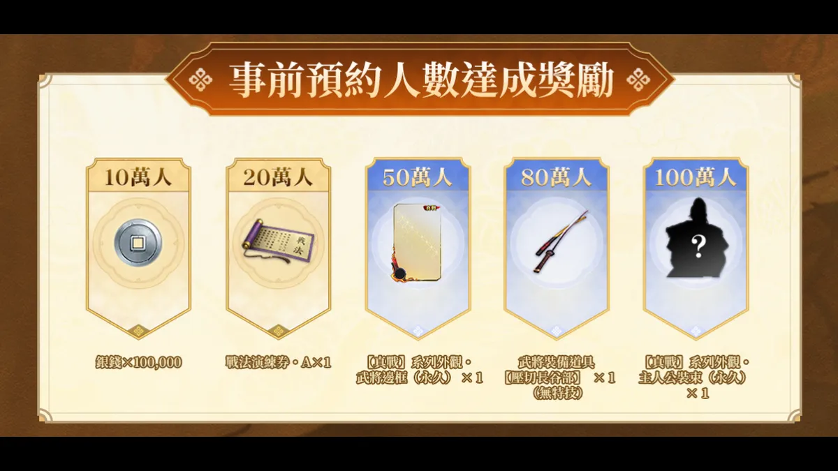 隨著預約人數不斷累積,獎勵內容也將更加豐富。當達成指定里程碑時,全服玩家更可解鎖「信長愛刀」以及首發限定永久主角外裝,展現戰國霸者的尊榮風采,期待主公們呼朋引伴,於遊戲開放的第一刻,一同踏入這本格戰國時代戰場。