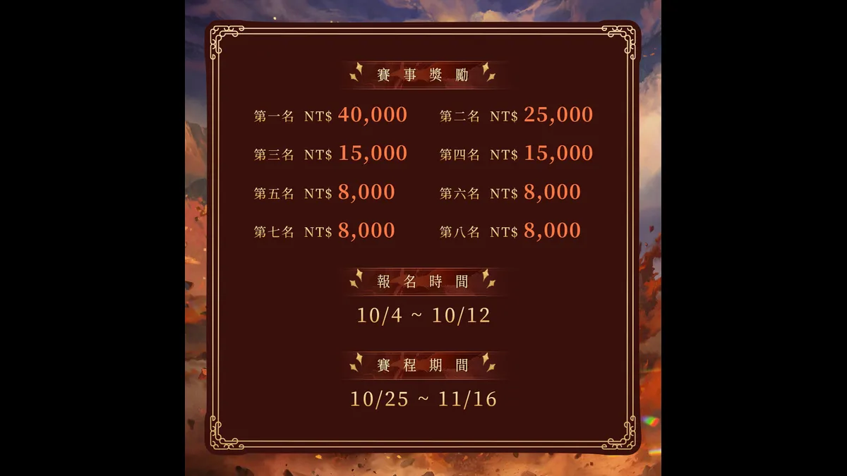 「韶華」象徵青春年華與盛世風華,亦是俠者揮劍立名、拔得榮耀頭銜的最佳時刻,由 CGA所主辦、這場屬於江湖俠士的榮耀舞台即將展開。幫會於 10 月 12 日前完成報名,即可在 10 月25 日至 11 月 16 日間參與線上賽事,冠軍將可獲得新台幣 4 萬元、亞軍 2 萬 5 千元、季殿軍各1 萬 5 千元,五至八名也能拿到 8 千元獎金,爭奪 127.000 元總獎金。