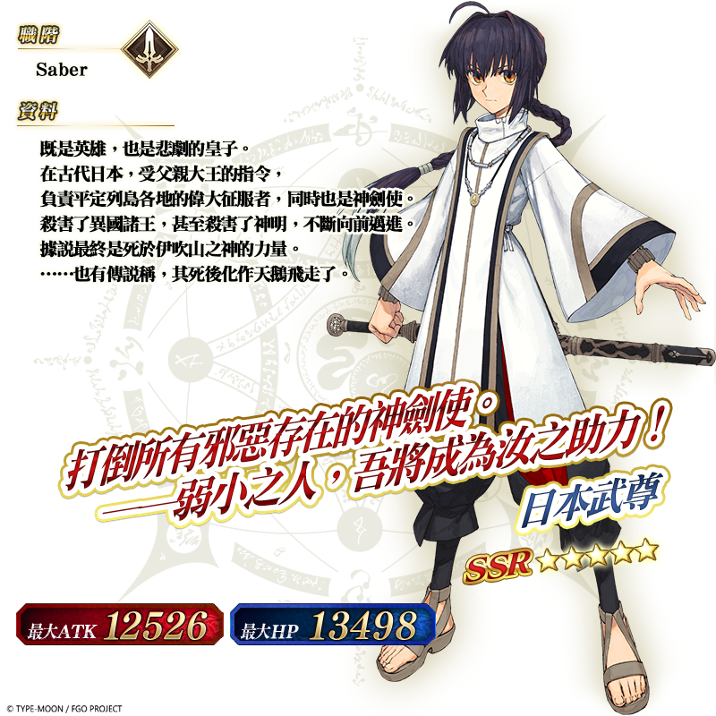 通關「特異點F 燃燒污染都市冬木」的御主,可於2025年10月12日(日)維護後至2025年10月23日(四)12: 59期間,透過限時開放的「日本武尊」體驗任務,體驗從者的技能及寶具,通關後將獲得獎勵「呼符1張」。同期間,在「蒐集種火」及「打開寶物庫之門」中,「★5(SSR)日本武尊」將作為支援從者限時登場.
