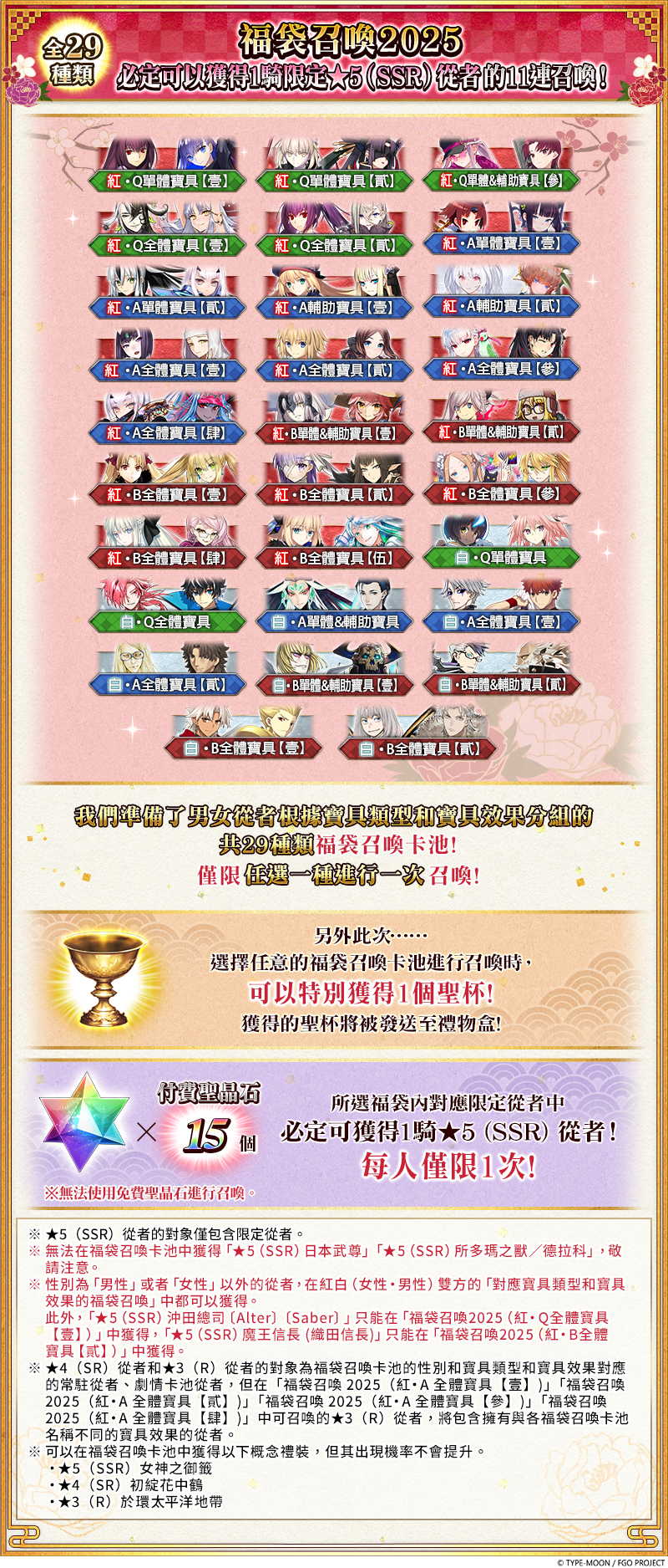 自2025年10月12日(日)維護後至2025年10月23日(四)12 :59期間,在「2025年新年福袋召喚(男女區別×寶具類型・效果區別)」中,是以男性及女性從者的各職階「寶具類型」及「寶具效果」分組,共分成2 9種福袋召喚卡池,使用15個付費聖晶石進行僅限1次召喚,必定獲得1騎限定★5(SSR)從者。