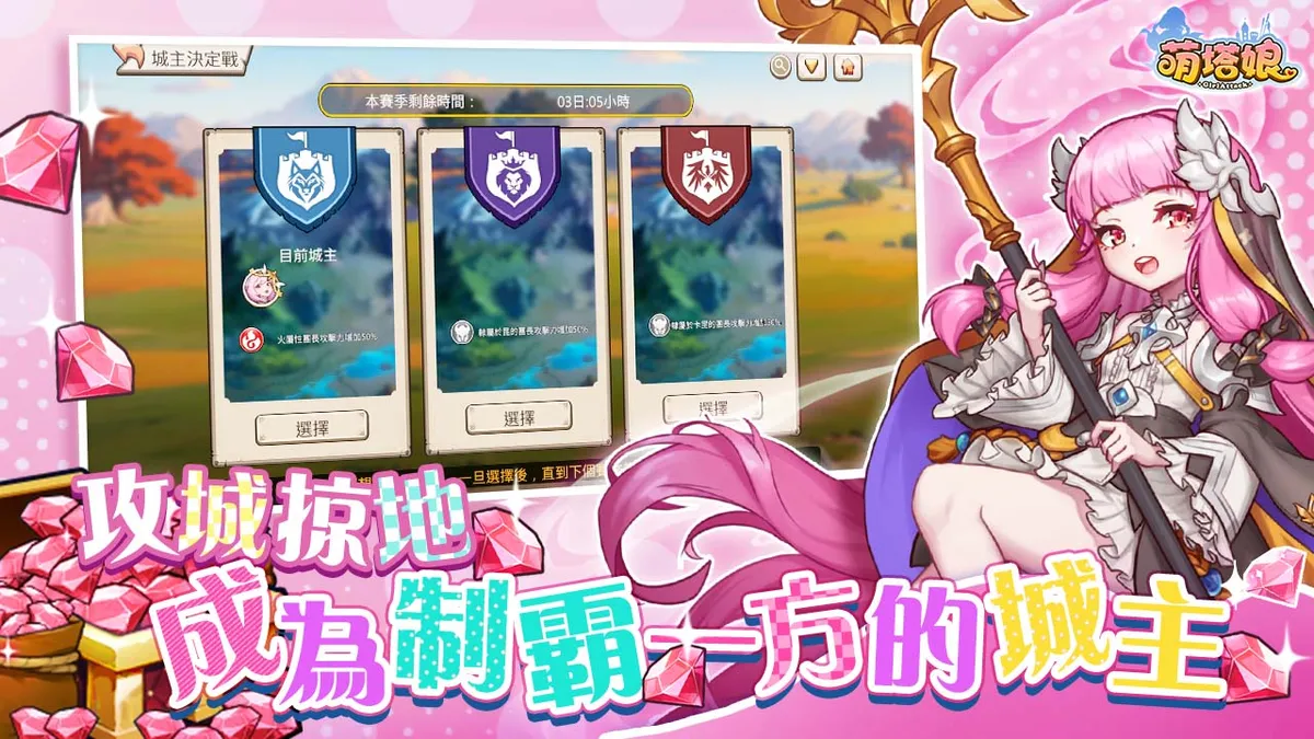 從三座城堡不同的加成效果中,挑選最適合自己的一座,接著率領你的萌塔娘騎士團和其他玩家展開刺激的攻城戰!