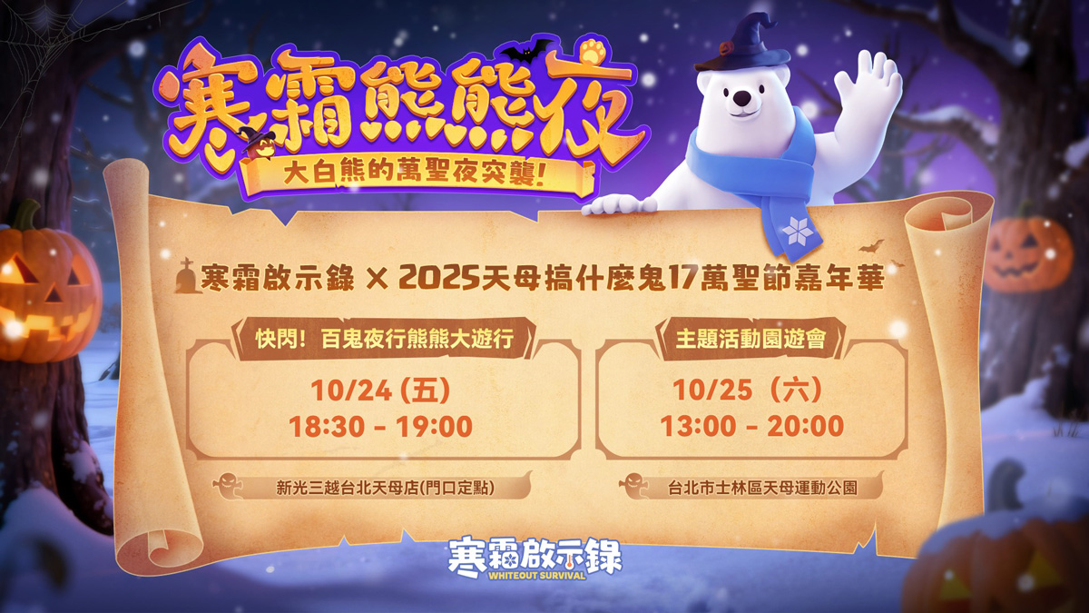 由 Century Games Pte. Limitado. Ltd.推出、杰遊有限公司發行,全球超過 2 Whiteout Survival)的大白熊將首度登場亮相,於10月24 、25兩日,在「天母搞什麼鬼」17萬聖節嘉年華舉辦「寒霜熊熊夜」活動,玩家只要在指定地點捕捉到大白熊,就可獲得糖果與限量贈品!緊接萬聖節之後,大白熊還將前往電競嘉年華WirForce 及新北歡樂耶誕城,在今年冬天好好的溫暖玩家!