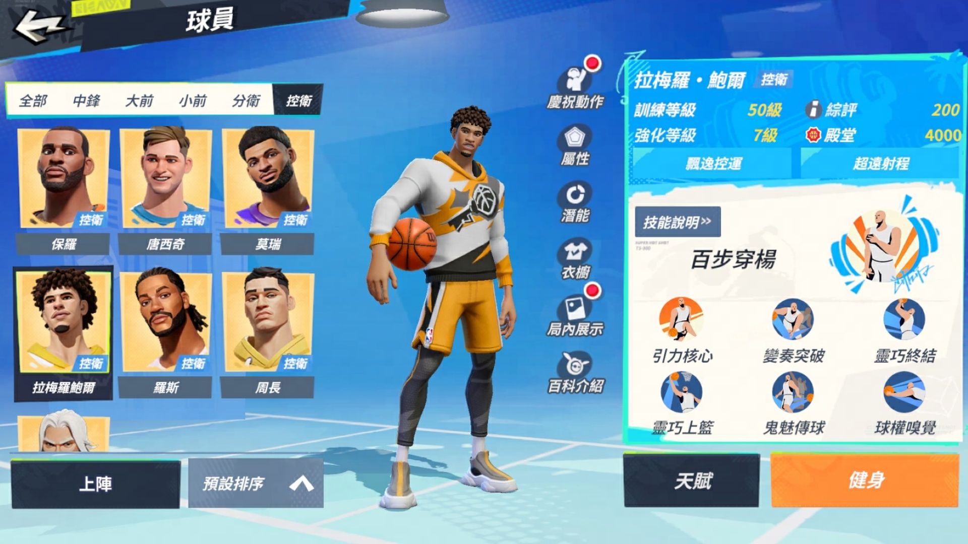 百步穿楊(爆發技):拉梅羅鮑爾在三分線外,突施冷箭將球投出。在無人干擾的情況下一定能命中,若有引力變奏增益時出手速率小幅增加.