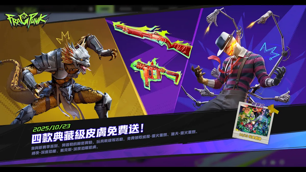 由艾肯娛樂代理的新世代 FPS 話題鉅作《FragPunk》今(23)日推出萬聖節限定版本!本次改版帶來全新 PVE 模式「玩具戰線」與萬聖節限定碎片卡,玩家將組成三人小隊在界外戰場迎戰叛變玩具軍團,展開刺激又惡搞的防線之戰。遊戲商城同步推出多款萬聖節主題界外之子外觀,讓玩家化身可愛又邪氣的南瓜惡靈,在萬聖節的氛圍中盡情釋放火力,感受不一樣的界外狂潮.