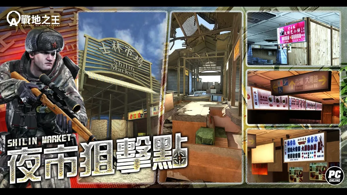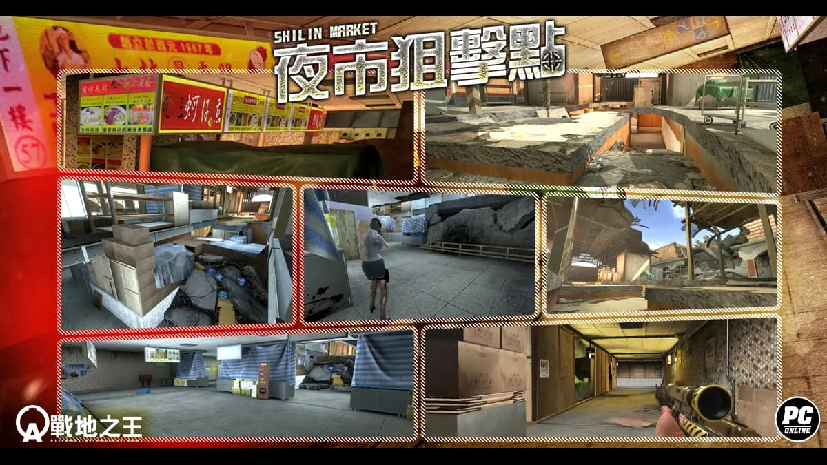 這張地圖以台灣最名聞遐邇的士林夜市為背景,獨特的室內與巷道結構成為狙擊手對戰舞台。在遊戲中,玩家將踏入幾乎完整複製的士林市場1 樓及 B1場景。狹窄的街道二側,隨地零散的桌椅、被戰火摧殘的蹋石,透露生死一線的肅殺氛圍,而讓人倍感熟悉的中文攤位招牌不再是美食的標誌,而是狙擊手辨識方位、規劃路線、甚至是掩護自身的重要地標.