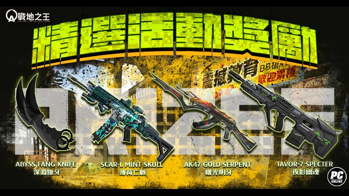 為慶祝改版全面開放,官方精心準備了十月限定的軍火補給,為菁英狩獵戰場提供補給支援。只要Tavor-7 Spectre 夜影幽魂」、「AK47 Gold Serpent 曙光明牙」、「SCAR-L Mint Skull 薄荷亡骸」、「Abyss Fang Knife深淵獠牙」⋯⋯等數把造型獨特且實用的武器,場上戰力包準一把罩!
