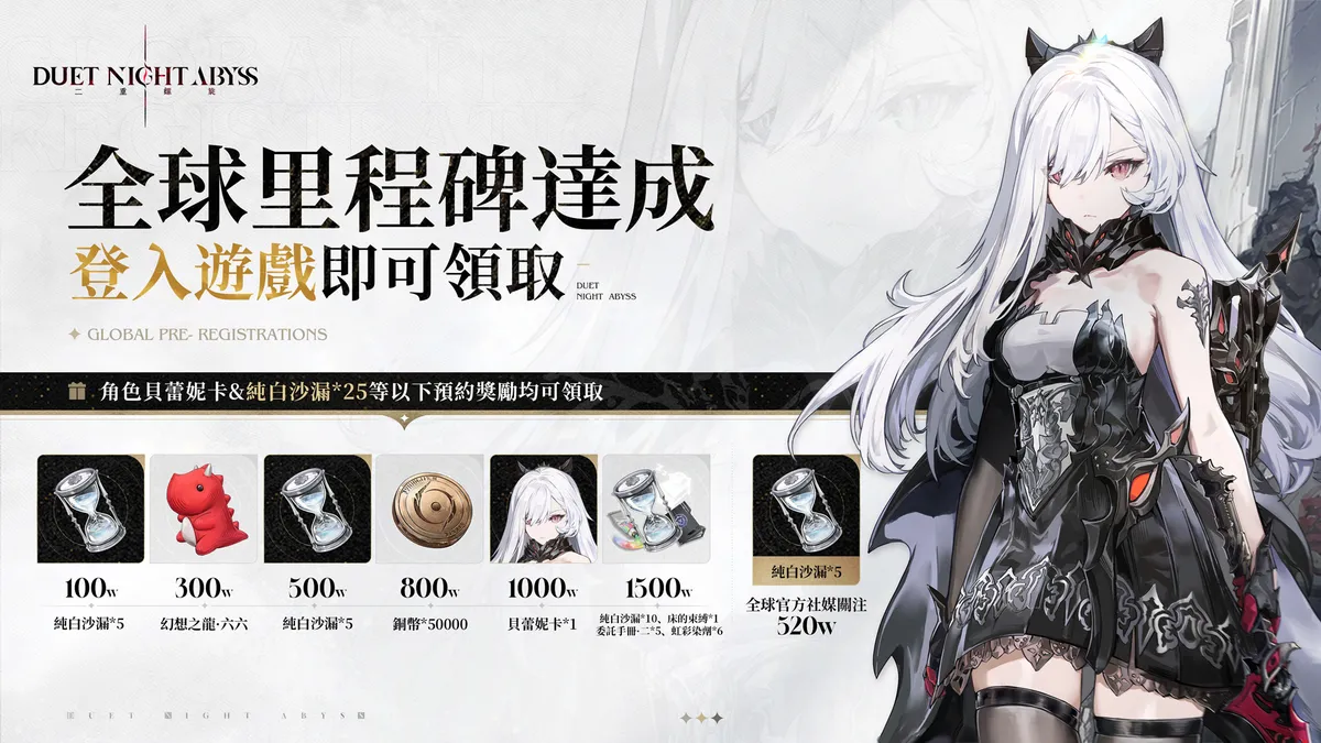 1.500萬。爲感謝玩家支持,所有玩家可透過遊戲內郵件領取限定角色「貝蕾妮卡」、 25 pulgadas de largo, 25 pulgadas de largo 7 位高品質角色.