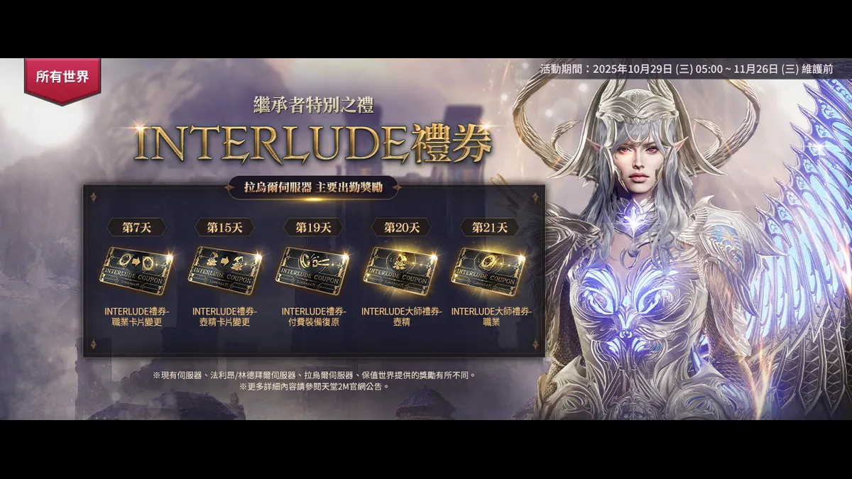 所有世界【INTERLUDE禮券】:29/10維護後~26/11維護前,活動期間內,透過每日優惠可獲得包含「殷海薩恩寵」、「INTERLUD E禮券」等各種豐富的獎勵。原始世界現有伺服器&法利昂、林德拜爾伺服器可獲得包含「神器變更、付費裝備復原、職業、壺精」共4張INTERLUDE禮券。保值世界則可獲得「壺精變更、付費裝備復原、職業、壺精」共4張IN TERLUDE禮券。新伺服器拉烏爾伺服器除了可獲得「職業變更、壺精變更、付費裝備復原」3種INTERLUDE禮券外,還可以再獲得「INTER LUDE大師禮券-職業、INTERLUDE大師禮券-壺精」共5張禮券.