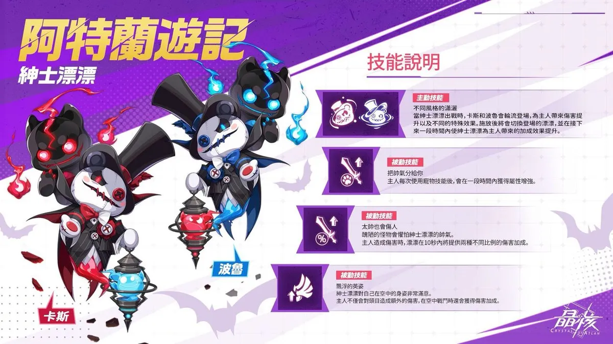 萬聖節主題時尚「猩紅祭禮」系列時尚及武器裝扮華麗登場,以典雅神秘的設計完美契合節慶氛圍!同時,全新寵物「紳士漂漂」震撼降臨,身為迷途的紳士,兼具邪惡與可愛的特質,絕對是冒險途中不可或缺的得力助手!