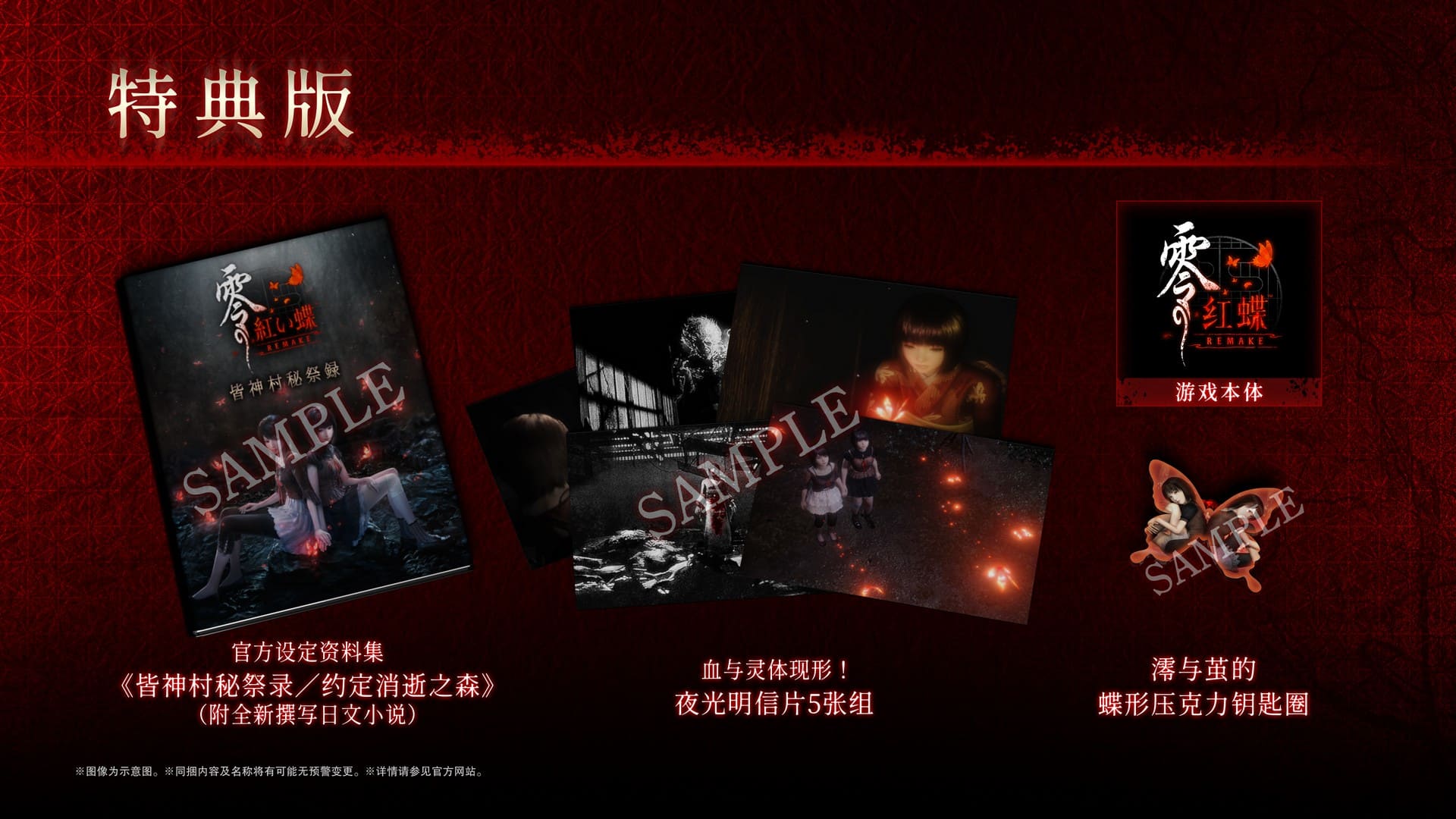 「特典版」中,除了遊戲本篇外,還包含了收錄全新日文小說的官方設定資料集「皆神村秘祭錄/約定消逝之森」、「血與靈體現形!夜光明信片」5入組、以及「澪與繭的蝶形壓克力鑰匙圈」。「典藏版」則除了包含「特典版」的所有內容外,還附加「『零~紅蝶~ REMAKE』主視覺 LED 相框燈箱」以及「零感毛巾」.