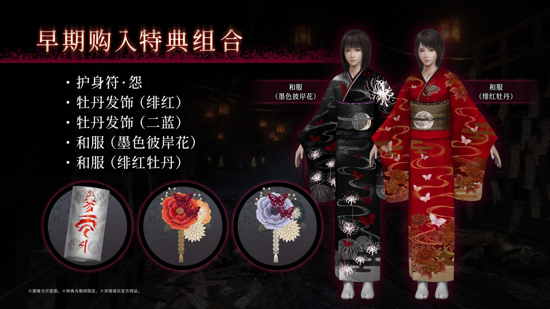 「護身符・怨」 「牡丹髮飾(緋紅)」 「牡丹髮飾(二藍)」 「和服(緋紅牡丹)」 「和服(墨色彼岸花)」 ※本特典為實體版與下載版共通. ※日後可能用於付費下載. ※實體版為首批特典;下載版需於 3 月 25 日(三)前購買方可獲得早期購入特典.