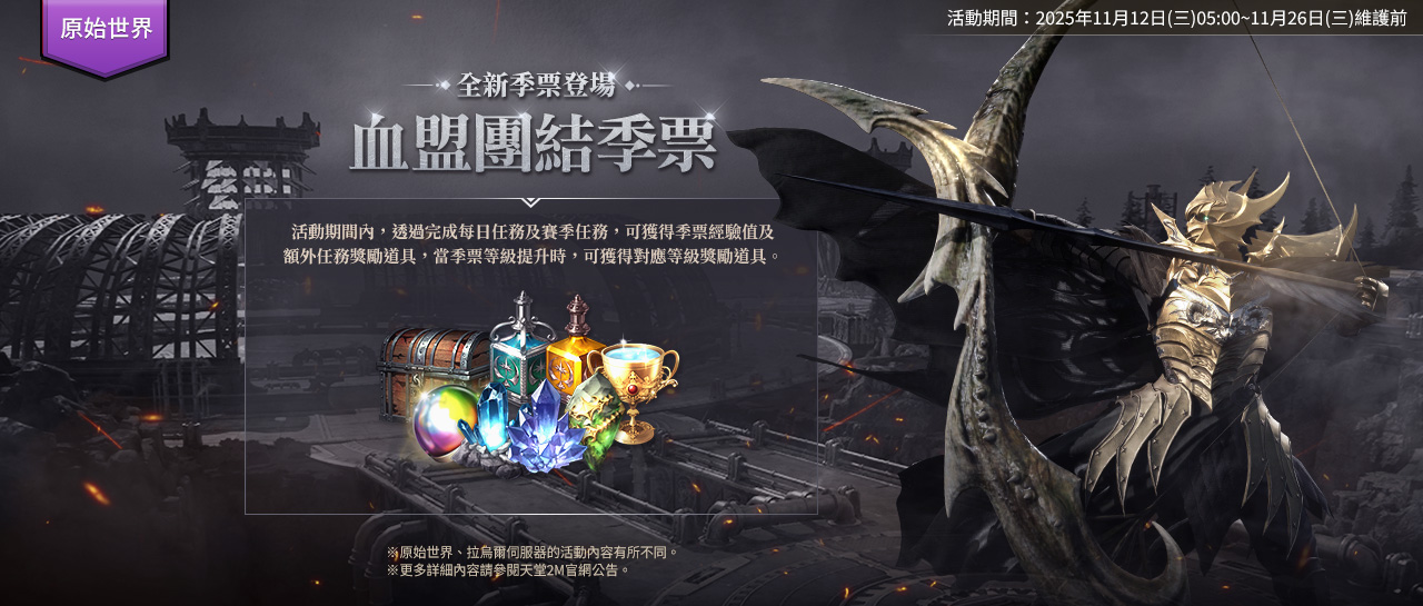 原始世界【血盟團結季票】:11/12維護後~11/26維護前,活動期間內,進行全新季票活動「血盟團結」,透過完成每日及賽季任務,可獲得季票經驗值,當季票等級提升時,可獲得對應等級獎勵道具。使用金幣開啟優質獎勵時,可額外獲得更多的獎勵報酬。