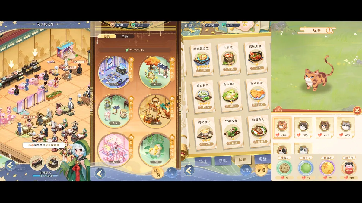 玩家會經營茶館,可以自行佈置茶館內部,遊戲也提供各種主題風格的裝飾品,不管是簡單使用套裝,或是喜歡混搭風格,都能依個人愛好進行佈置。遊戲也加入了養成要素,玩家透過員工養成和指派,獲取獎勵與以提高服務速度,可以更進一步提升茶館經營能力,隨著茶館不斷的擴增,最終形成更龐大的酒樓事業。光是經營並不足夠,玩家也可以在遊戲研發各種美食和打造夢幻的喵樂園,不只能與可愛的貓咪互動,還能把它們安置在酒館內,實現古代版的貓咪茶館。