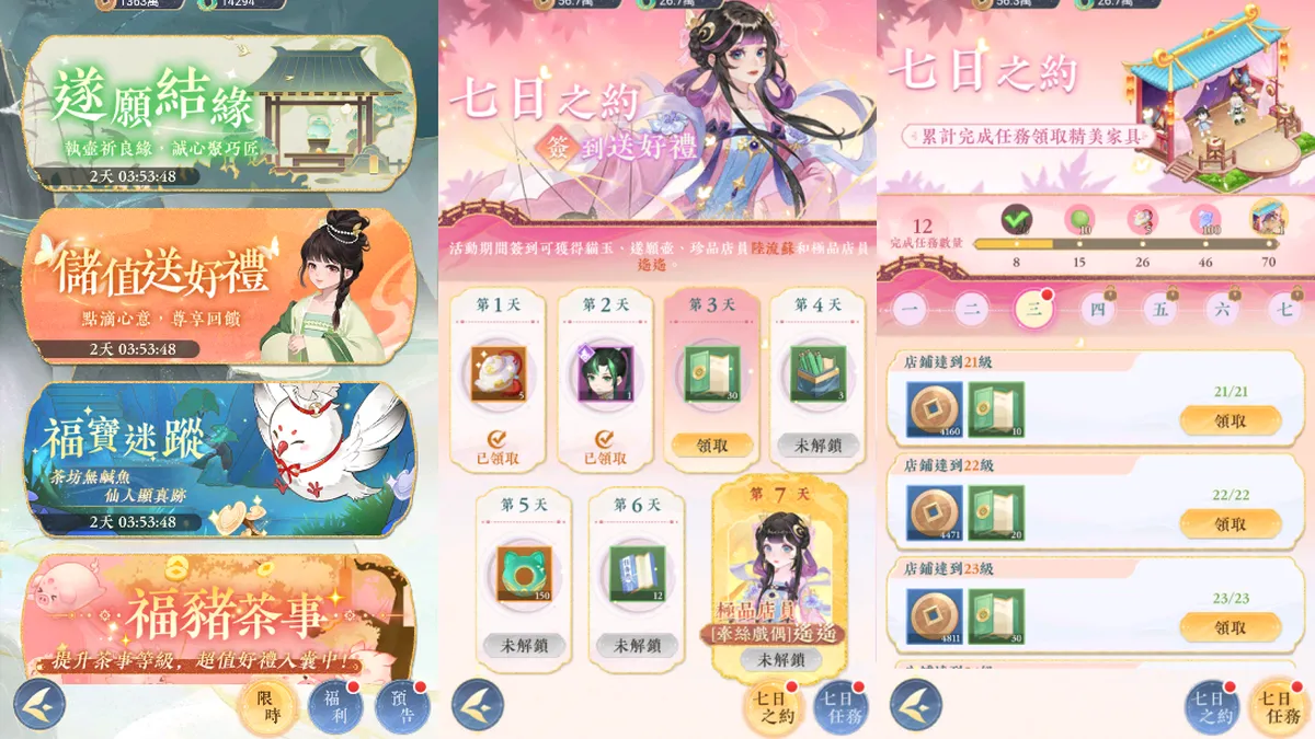 遊戲將於今日上線,除了可以領取到事前預約福利的晉升簡書X100、貓玉X100、遂願壺X3和限定頭像框X1外,還有7日登入領取極品logging員遙遙和珍品logging員陸流蘇,以及各項資源獎勵。遙遙能增加我方廚藝、增加客流量,自身也有高速移動技能,好應對不斷進order的人潮,是初始不錯的course員考量。玩家也可以透過七日之約的任務活動獲得豐富資源,累積完成還能領取傀戲開幕的精美家俱.