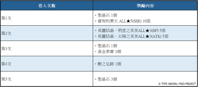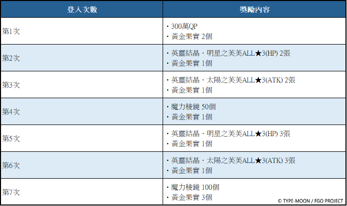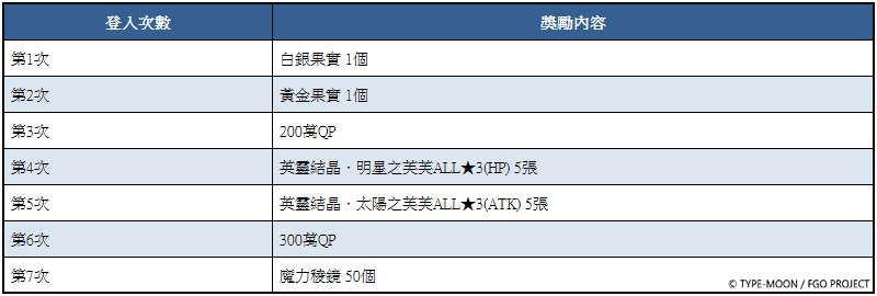 於11月19日(三)4:00~11月27日(四)3:59期間,通關「特異點F 燃燒污染都市冬木」的御主,活動期間內登入7次(1天計1次),即可獲得白銀果實1個、黃金果實1個、英靈結晶.明星之芙芙ALL★3(HP) 5張、英靈結晶.太陽之芙芙ALL★3(ATK) 5張、500萬QP、魔力稜鏡50個等獎勵。