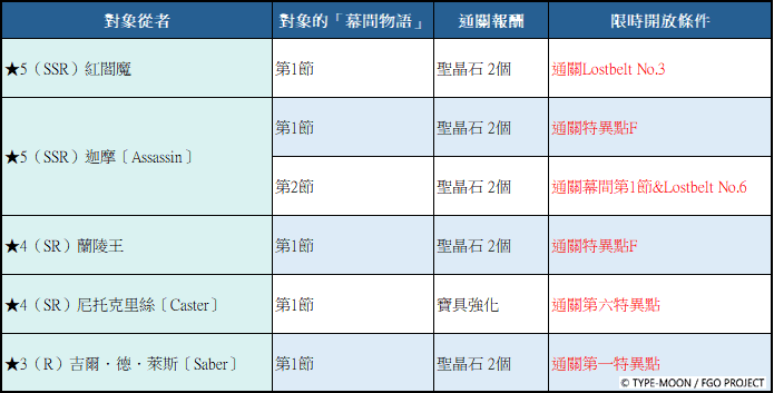 | 「Lostbelt No.7」&「奏章I 虛數羅針內界 平面之月」相關從者「幕間物語」限時開放條件 |