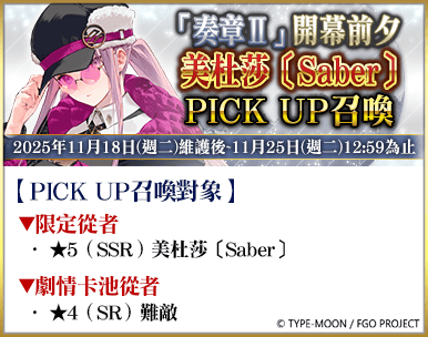 即日起至11月29日(六)15:59期間,限定從者「★5(SSR)美杜莎〔Saber〕」、「★5(SSR)杜爾迦」及劇情卡池從者「★5(SSR)怖軍」等在內的4騎從者,將在『「奏章Ⅱ」開幕前夕紀念活動』的3種召喚卡池中登場.