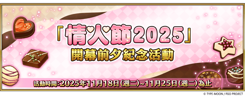 AP消耗量,皆將限時降為1/2;在任務開始時的支援選擇介面選擇其他御主的對象從者作為支援或自己的對象從者被其他御主選為支援時,所獲得的友情點數將變為2倍。此外,在限時活動「情人節2025」活動期間,部分從者將在活動任務中被賦予「自身的攻擊威力提升」以及「羈絆點數獲得數量提升」的效果.