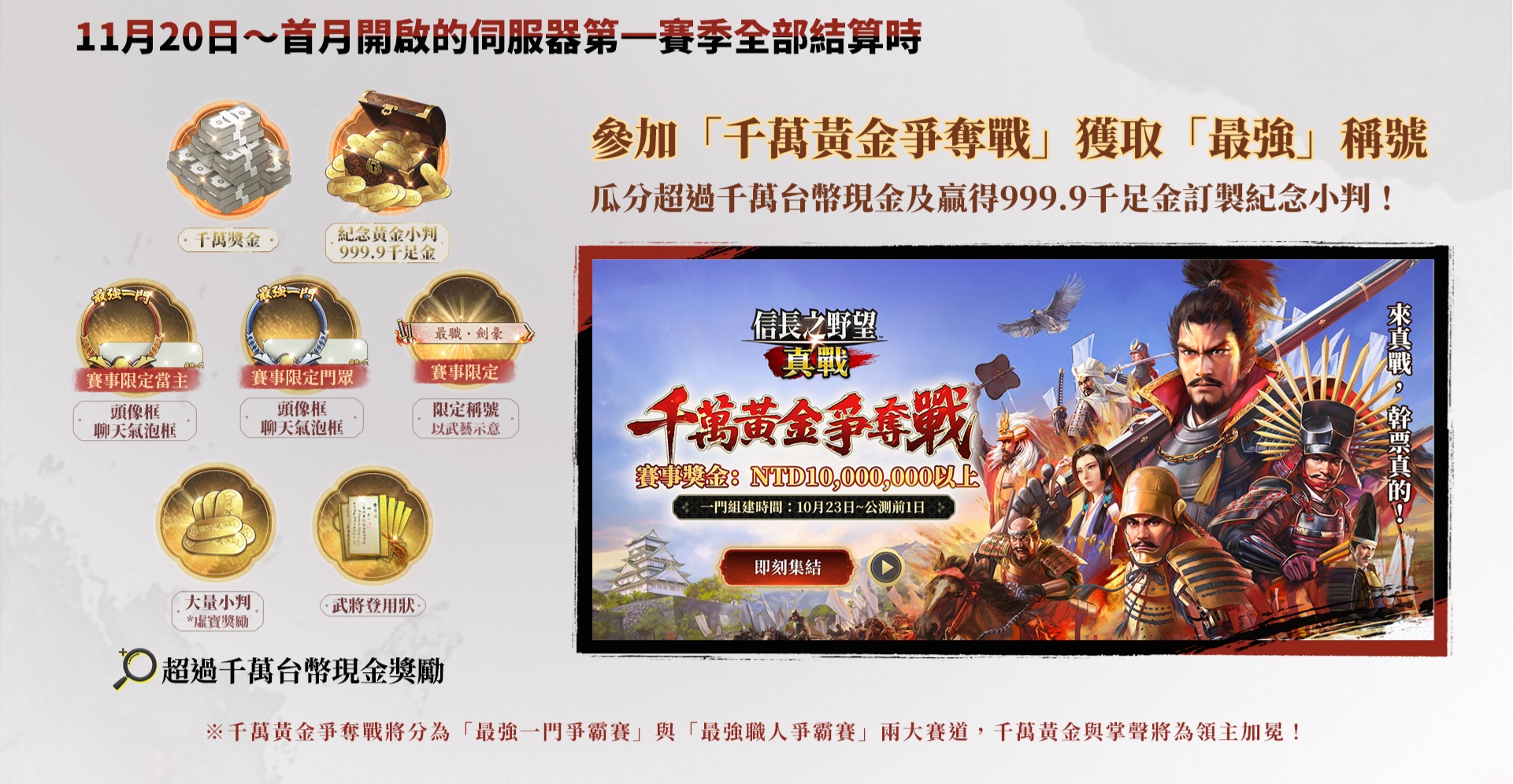 伴隨《信長之野望真戰》公測上線的,還有重磅賽事「千萬黃金爭奪戰」的開啟,賽事分為聯盟對抗的【最強一門爭霸賽】與個人競技的【最強職人爭霸賽】兩個項目雙軌競爭,千萬台幣和實體黃金的獎勵吸引多位人氣網紅與創作者加入這場戰國亂鬥中,未參與到「預創一門」活動的玩家們,在《信長之野望¡OB!