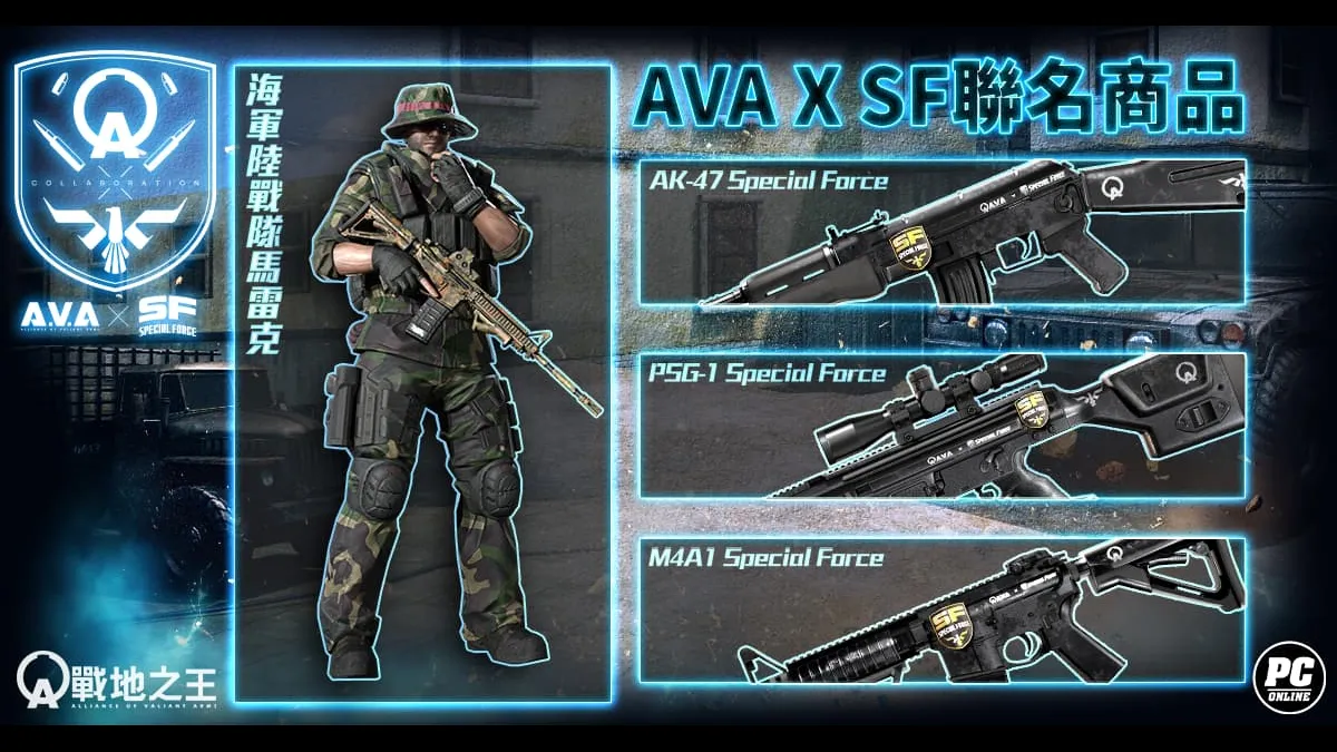 Fuerza Especial En línea》的經典角色外觀致敬,另外,本次合作中還推出的聯名槍枝「M4A1 Special Force」、「AK-47 Special Force」和「PSG-1 Special Fuerza」,並完整保留原版射擊及更換彈匣音效,當玩家使用聯名武器射擊時,耳邊響起的是當年「隔壁棚」熟悉又具有特色的槍聲,使得這場跨越遊戲界線的夢幻聯動更具情懷.