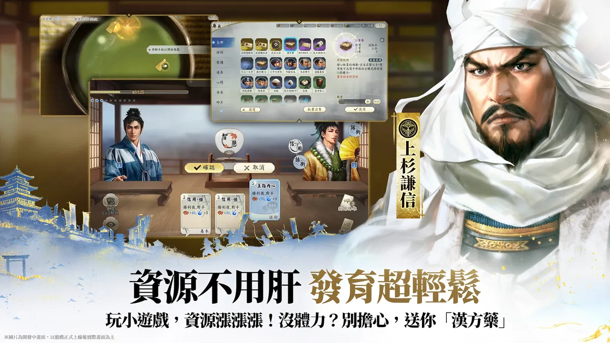 資源爭奪是策略遊戲的一大樂趣!在過往的遊戲中,玩家只能靠攻打有限的資源地獲取資源,但本作新增多元資源提升管道,玩家能從簡單有趣的戰國小遊戲,獲得戰場資源與戰鬥加成等等。還有如回復體力的「漢方藥」,減少玩家重複養成的「無損換將」功能等創新設計,讓玩家能夠從傳統SLG無休止的「爆肝」循環中解放出來,實現真正的輕鬆發育.