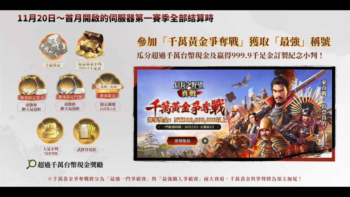 隨著《信長之野望真戰》正式上線,千萬黃金爭奪戰也正式拉開序幕。本次賽事包括【最強一門爭霸賽】和【最強職人爭霸賽】,挑戰瓜分總獎金1000萬台幣、紀念黃金小判。上線首月的伺服器均能參與到本次賽事中,馬上下載遊戲,一起來爭奪千萬獎勵!除了賽事外,還有豐富的開服福利等著你來!