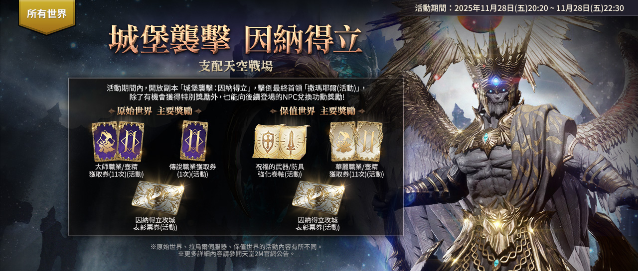 「城堡襲擊:因納得立」活動,將於「城堡襲擊:因納得立(活動)」副本內進行,開放入場時間為:11/28(五) 20:20~22:30。原始世界限定65級以上;保值世界限定60級以上玩家可入場。進入活動副本後,將會自動移動至因納得立城集結地3處中隨機1處。