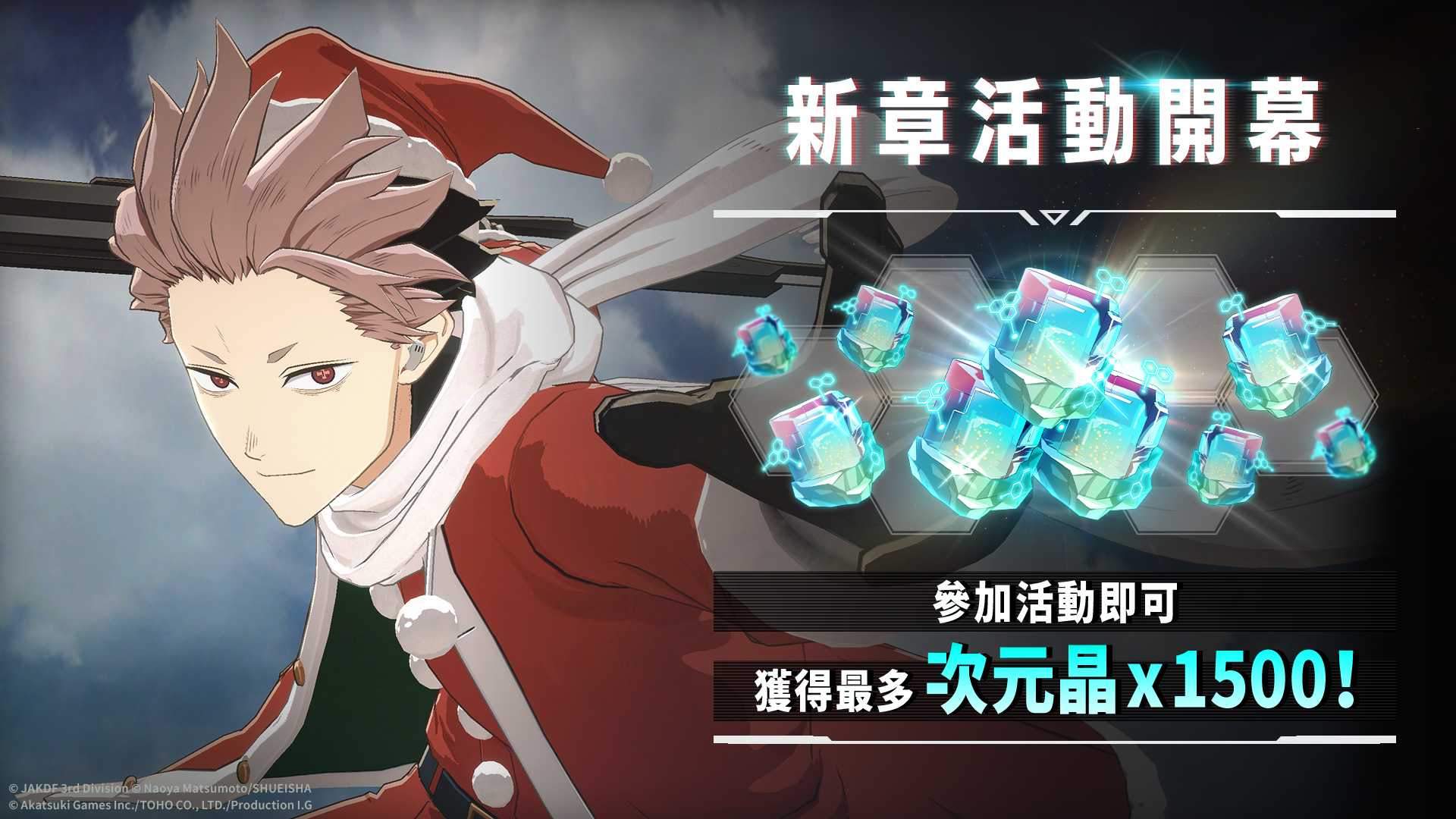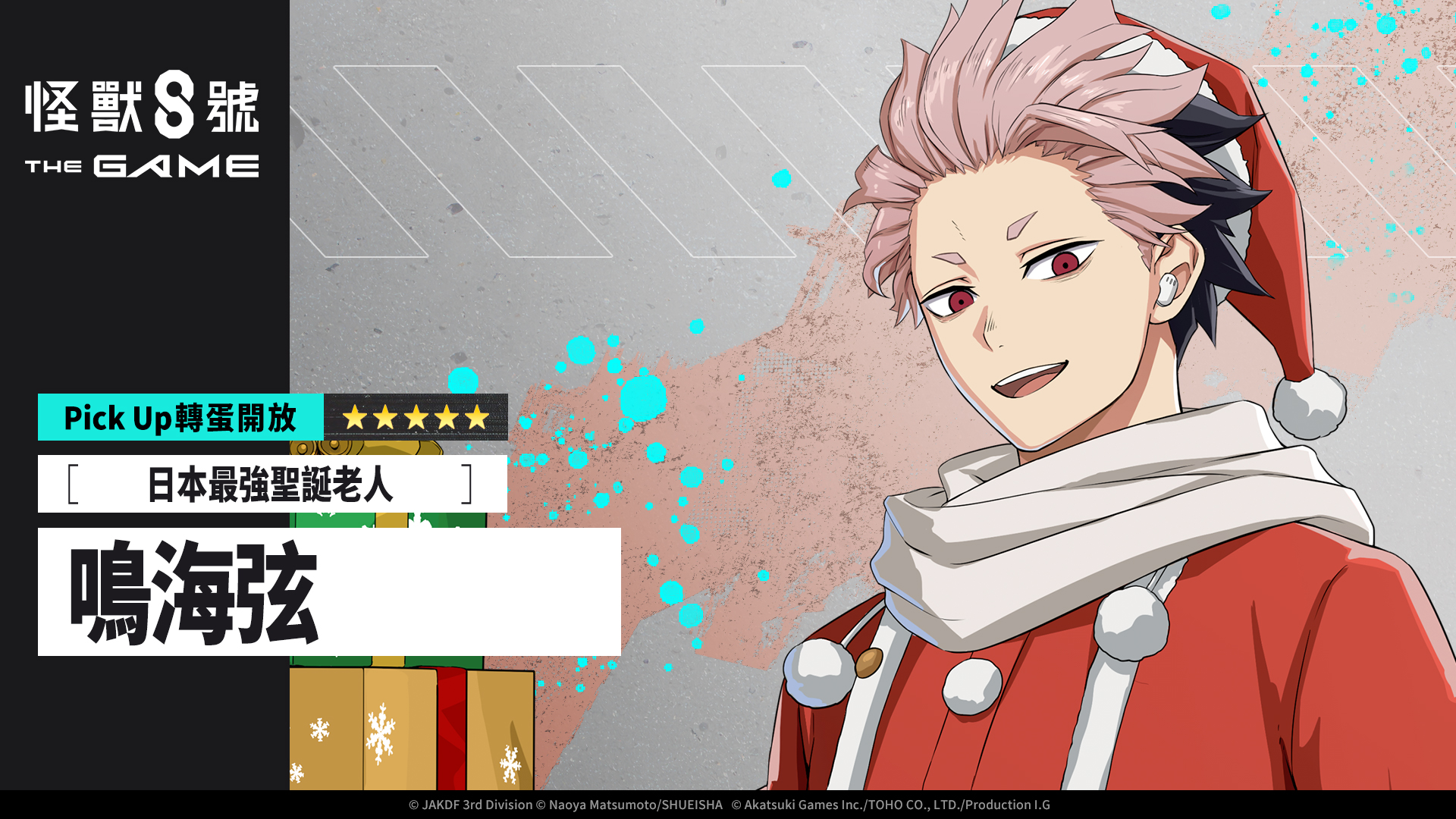 由 Akatsuki Games、TOHO 以及 Production I.G, 共同製作的智慧型手機與 PC 遊戲「怪獸 8號 THE GAME」今日宣佈,開放主線劇情6 章,並推出紀念主線劇情開放的新章活動,玩家有機會獲得最多次元晶 1500 個,並於 6章開放紀念登入獎勵獲得最多 10 張轉蛋票券。同時,本次更新亦釋出了全新 ★5角色——身穿聖誕老人裝的 ★5[日本最強聖誕老人]鳴海弦,其 Recoger 角色預告片也正式解禁.