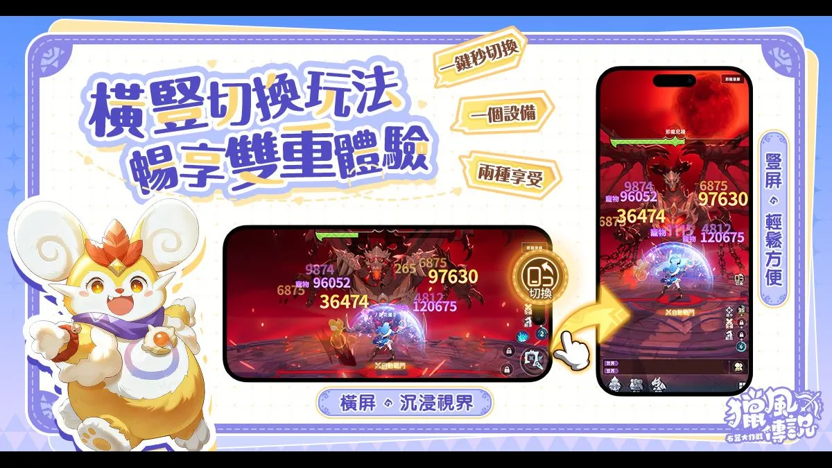 遊戲內置「一鍵切換」創新視覺系統,讓您在不同場景下都能找到最舒適的遊玩方式。通勤時輕鬆豎屏單手操作,解放雙手;回家後切換橫屏,盡享全景沉浸體驗。無論是短暫閒暇還是深度遊玩,都能隨心所欲,暢遊獵風傳說.