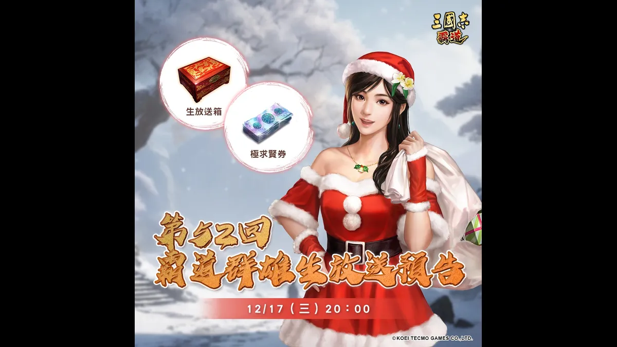 MMO戰略模擬手機遊戲『三國志 霸道』將於 12 月 17 日(三)20:00 GMT+8 於官方Facebook粉絲專頁與臺灣光榮特庫摩YouTube 頻道舉辦《霸道群雄生放送》第 52回直播活動,節目將由氣質型人氣女主播-茉晶、以及戶外健美知名演員-UZ張耘芝聯手主持,並與臺灣光榮特庫摩亞太地區董事暨副總經理劉政和先生一起與玩家們互動並帶來好禮和宣布遊戲最新改版資訊以及活動預告.