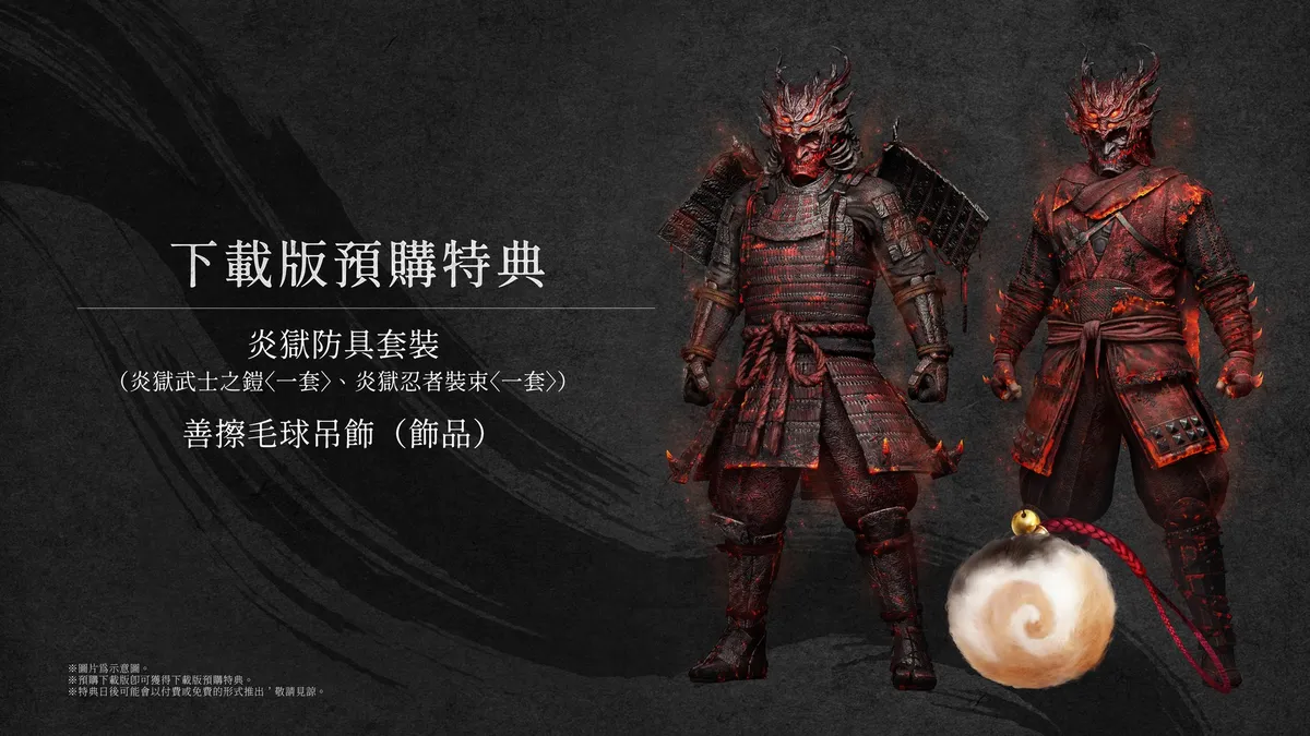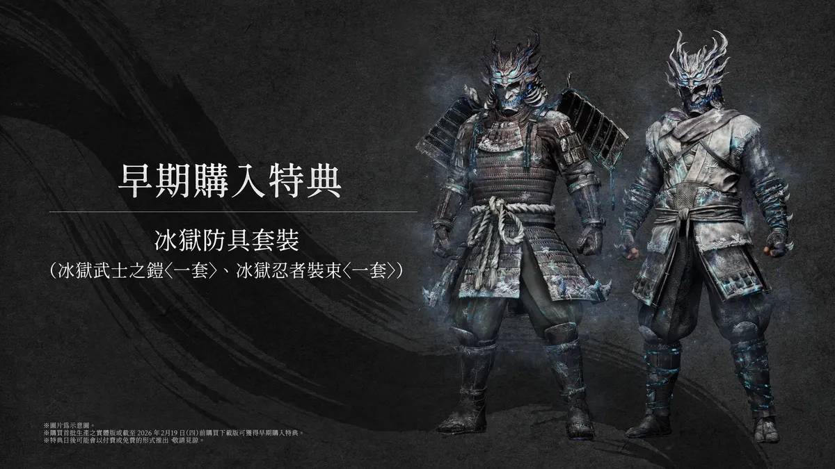 追加特典為『仁王』主角威廉的防具套裝「少武者中鎧」一套,以及『仁王2』主角阿秀的防具套裝「無緣人之鎧」一套。追加特典需在相同平台、相同帳號下載早期購入特典「冰獄防具套組」後方可獲得!只要購買首批實體版或於2026年2月19日(四)前購買下載版即可獲得早期購入特典,玩家們別忘了提前預購.