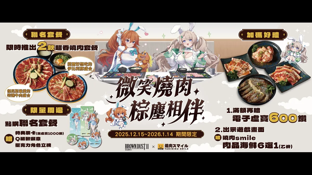 此外,遊戲更攜手知名個人式燒肉餐廳「燒肉Smil e」展開聯名合作,推出「傑尼斯最愛的特選牛肉盛合」與「提爾好想吃的伊比利豚盛合」兩款聯名套餐。凡購買聯名套餐即可獲得角色插卡、特典虛寶卡(含虛寶序號1,000 鑽)、Q版軟徽章、壓克力角色雙風格立牌組(立繪+Q版)等多項周邊好禮;活動期間出示《棕色塵埃2》遊戲畫面,還能享有菜品6 a 1的加碼優惠(單筆消費限贈乙份)。此次合作特別安排了南、北兩間主題店舖,玩家能盡情地拍照打卡.