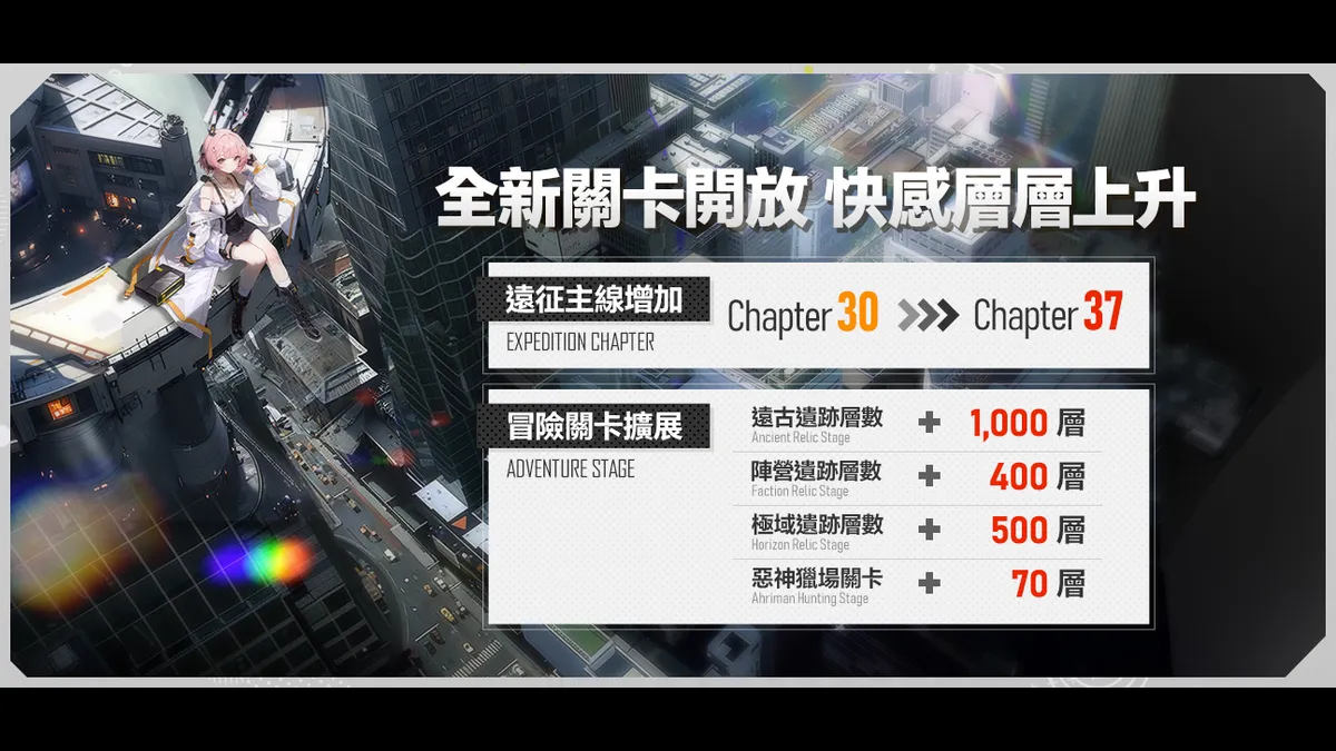 玩家期待已久的內容擴充正式登場!主線“遠征”新增七大章節;冒險關卡上限同步提高,並搭配全新機制與豐富的獎勵,進一步提升挑戰樂趣。官方表示,本次更新不只是「回歸」,更是一次真正的「成長型擴張」.