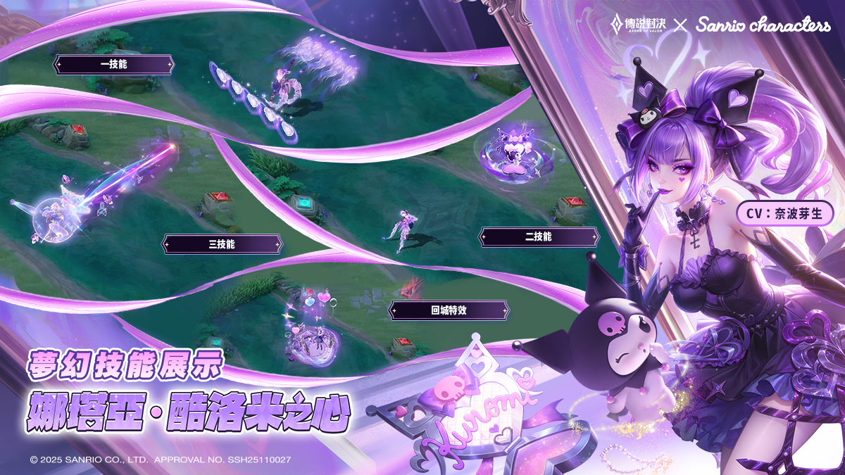 傳說英雄娜塔亞推出酷洛米聯動造型,融合肖像經典元素打造酷萌氛圍.一技能特效以紫色愛心點綴,發射獨特的紫色法球,二技能的法球則是化為酷洛米造型的化妝鏡,施放三技能時更會展現酷洛米形狀的護盾特效,視覺效果華麗。而回城特效化身夢幻化妝間場景,燈光閃爍、少女心滿滿。