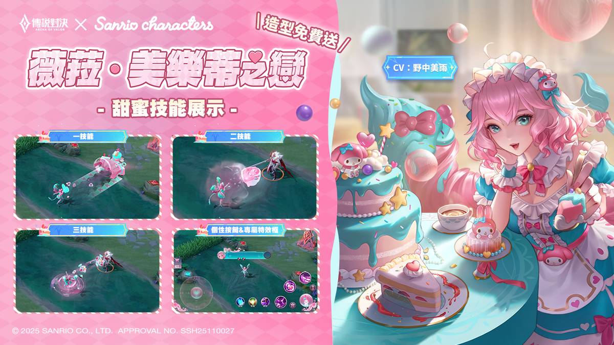 傳說英雄薇菈推出美樂蒂聯動造型,將甜蜜可愛與精緻優雅完美結合,展現滿滿療癒氣息。一技能化為放滿甜點的夢幻餐桌,二技能則化為香氣四溢的可愛咖啡杯。施放三技能時,隨著其旋轉舞動,周圍接連出現超萌聖代,甜美氛圍瀰漫全場。即日起至1 月 13 日,參與夢想泡泡活動,完成任務獲得許願機會,即可免費獲得!