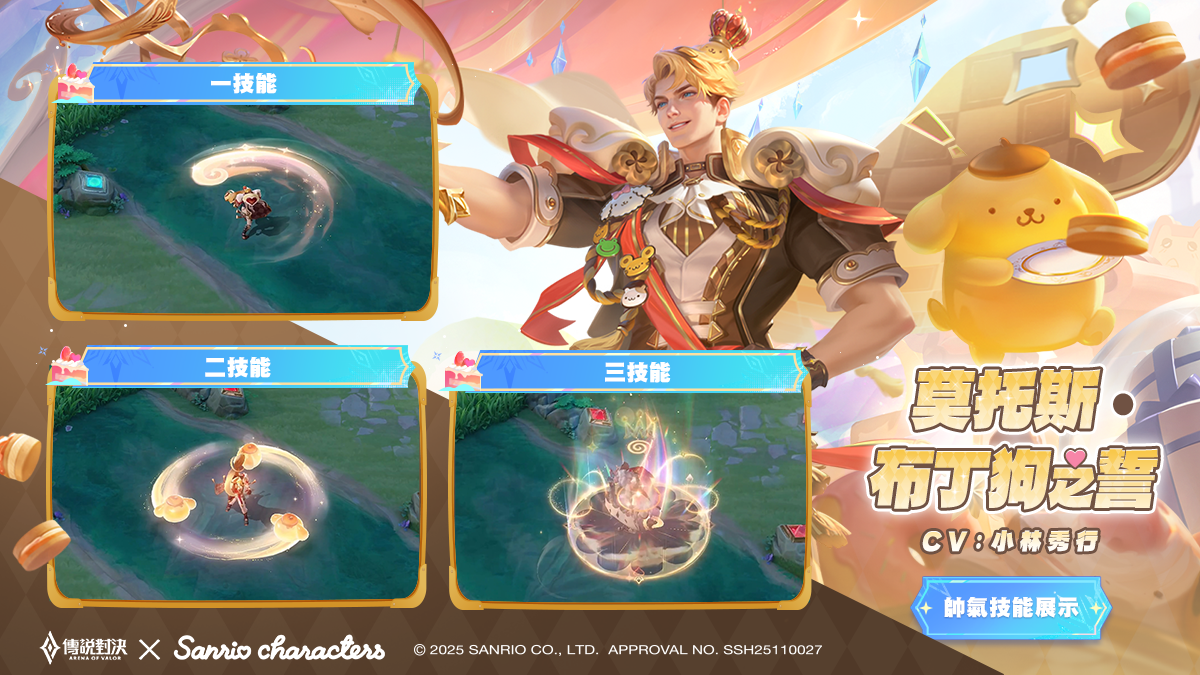 此外,全新「莫托斯 ・布丁狗之誓」聯動造型同步帥氣登場。一技能揮舞時帶出焦糖般流動的華麗特效,被標記的敵人將浮現晶瑩如蜂蜜的王冠印記;二技能施放時,布丁狗造型的魔法布丁於周身環繞;釋放三技能瞬間,王冠與星光閃耀登場,地面化為舞台般,散發雲霧與微光交錯。