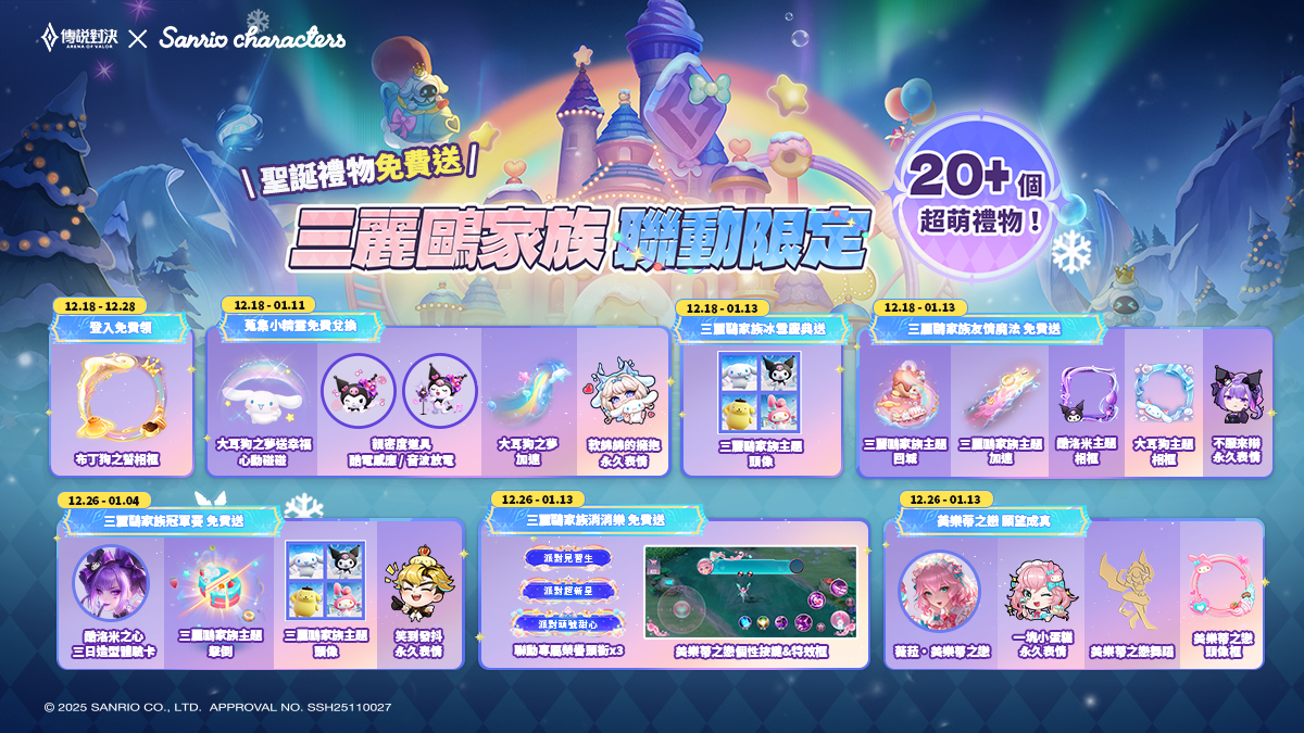 《Garena 傳說對決》宣布首度與《三麗鷗家族》展開跨界聯動合作,活動於 12 月 18日(四)起正式開始。此次合作中,來自三麗鷗家族的酷洛米、美樂蒂、布丁狗以及大耳狗喜拿等四位人氣明星,將攜手《傳說對決》的英雄們一同迎接12月的傳說冰雪節。不僅如此,玩家只需參與活動指定任務,更可免費獲得「薇菈・美樂蒂之戀」聯動限定造型,更多專屬活動內容與福利也將陸續登場.