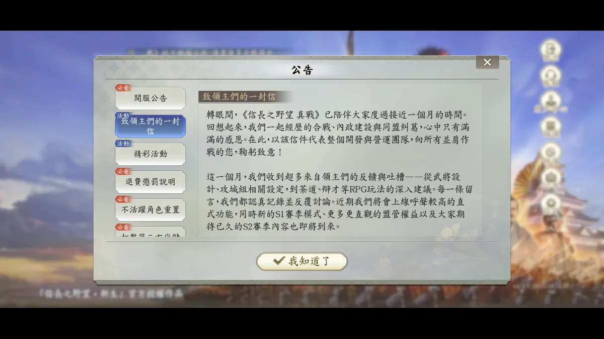 在持續改善現有遊戲體驗的同時,《信長之野望真戰》的長期營運規劃亦穩步推進。官方於遊戲內「致領主們的一封信」中首度透露——備受期待的S2新賽季內容已進入準備階段。更多關於新賽季的玩法介紹與核心特色,將於後續釋出更多相關資訊,敬請期待!