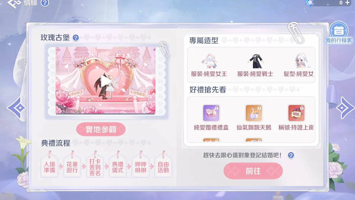 老RO玩家的浪漫必須盛大!完成誓約後,新人可策劃一場專屬婚禮:從熟悉的南門出發,乘坐花車沿著充滿記憶的街道巡遊、拋灑喜糖,接受全城玩家的喇叭祝福。抵達教堂後,在玫瑰與燭光中交換誓言,並通過趣味滿滿的「默契問答」,答案必須完全一致,就像當年配合打王一樣默契.