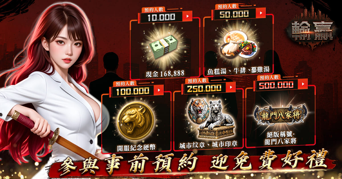 《輸贏》於今日同步舉辦「事前預約」及「勢力撂人來撐場」等活動.凡參與上述活動的玩家,即可在遊戲上市後,獲得包含「現金(遊戲幣) 168,888」、「開服紀念硬幣」、「絕版稱號 –龍門八家將」、「城市纹章」、「城市印章」⋯⋯等練功道具與限定獎勵,此外,還有機會取得必出高級時裝的「英雄服裝確定券」與頂級稀有度道具的「【會長級】秘密金庫」、「【理事級】戰備物資」和「【組員級】入會禮包」等豐富好禮.